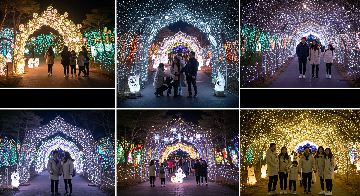 커플 여행이라면 포토랜드 입구→빛의 숲→달토끼 포토존→고흐별빛정원→기찻길 코스를 추천합니다. 가족 여행은 유아 동선을 고려해 초반 40분을 넓은 동선 구간에서 보내고, 유모차는 메인 포토존의 반대쪽 경사로를 활용하면 편합니다. 야간에는 노면이 어두운 구간이 있어 휴대폰 손전등을 켜고 이동하면 안전해요.